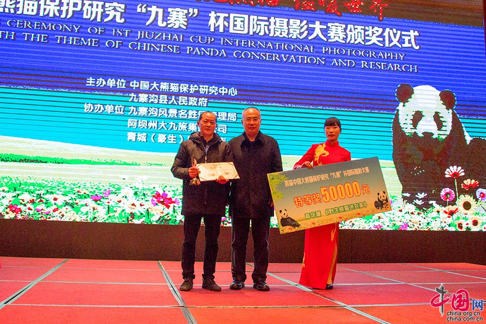国家林业局保护司副司长、中国大熊猫保护研究中心党委书记张志忠为特等大奖获奖选手高华康颁奖