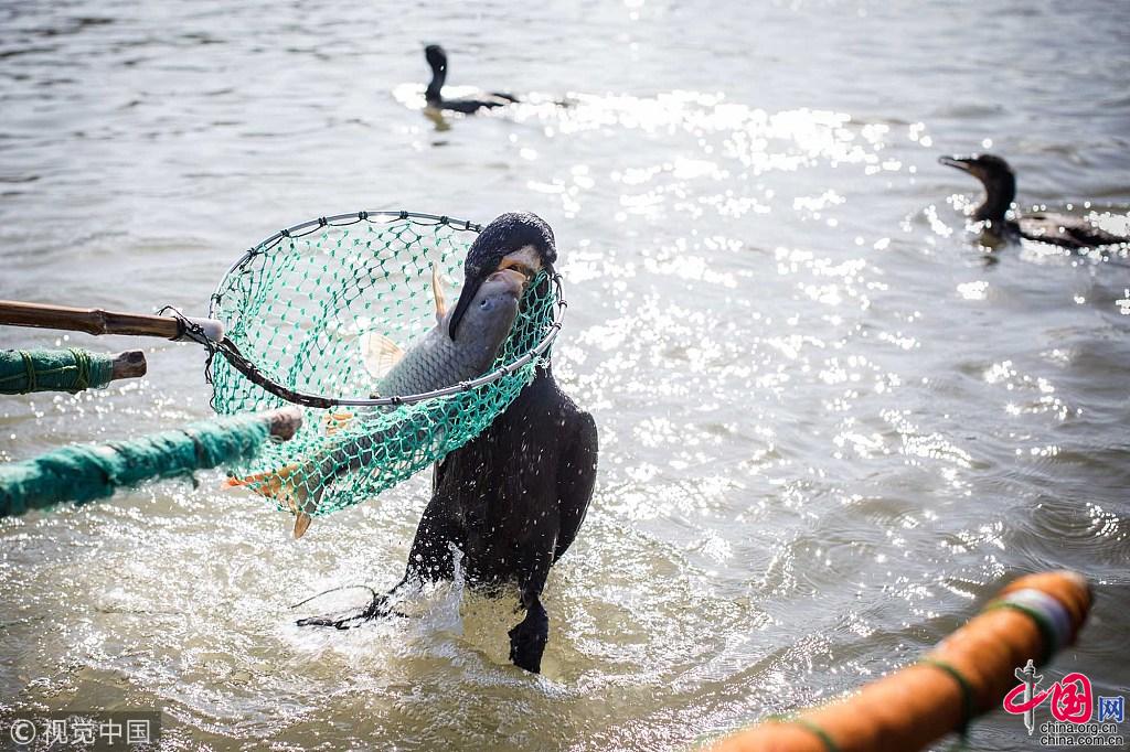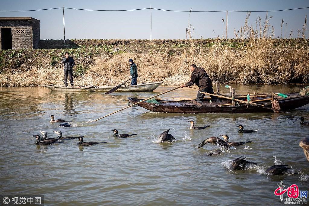 王海家承包了30公里的河道,养了180只鸬鹚捕鱼。鸬鹚捕鱼,对王海来说是一门祖传八代的技艺。但是,随着现代捕鱼技术的发展,鸬鹚捕鱼这门苦差事被越来越多的渔民抛弃,已经濒临失传。“因为使用鸬鹚捕鱼会特别辛苦,尤其是冬天,零下5度的低温里,还得下河,几乎每个人手上都有冻疮老茧,现在袁家庄也只有我们一家会用鸬鹚捕鱼了。”王海说。图片作者:牛镜/视觉中国