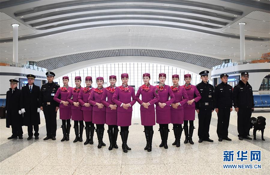 1月16日,担任渝贵铁路首发列车值乘工作的司机、乘务员、乘警等在重庆西站亮相。 新华社记者王全超摄