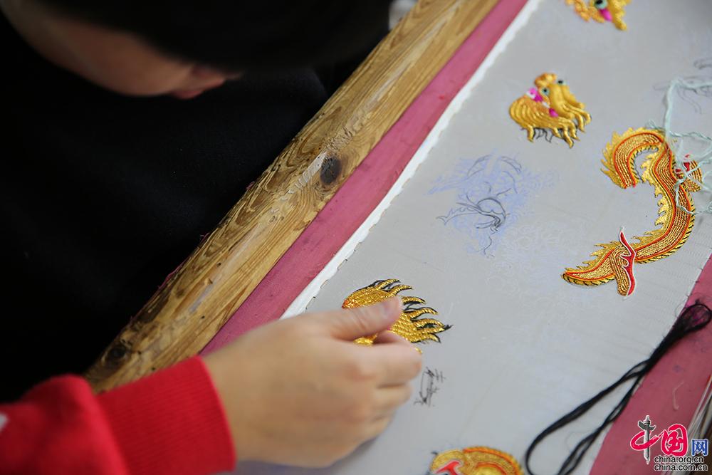 李淑英的女徒弟周溢正在运用钉金绣的绣法绣制作品。钉金绣是潮绣其中的一种绣法,运用垫、绣、贴、拼、缀等技术处理产生浮雕式的艺术效果。中国网记者 刘桢珂摄影