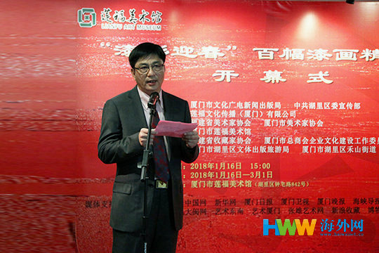 海外网1月17日电 1月16日,由厦门市文化广电新闻出版局、厦门市湖里区委宣传部、莲福文化传播(厦门)有限公司联合主办的“漆彩迎春——百幅漆画精品展”在厦门莲福美术馆隆重开幕。此次活动受到了社会各界广泛的关注,相关政府领导、艺术界和收藏拍卖界人士以及漆画爱好者等众多嘉宾出席了本次开幕式现场。