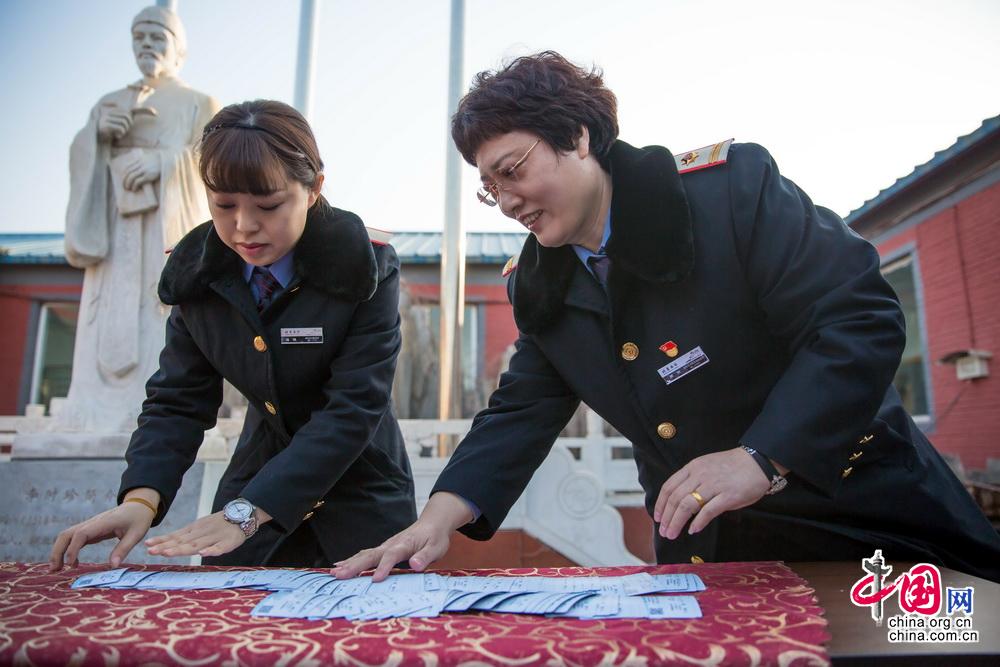 2018年1月19日,北京西站售票车间安排专人为务工人员购票较为集中的北京仟草中药饮方有限公司和北京本草方源药业有限公司送票上门。图为北京西站售票车间职工现场清点车票。中国网记者 郑亮摄