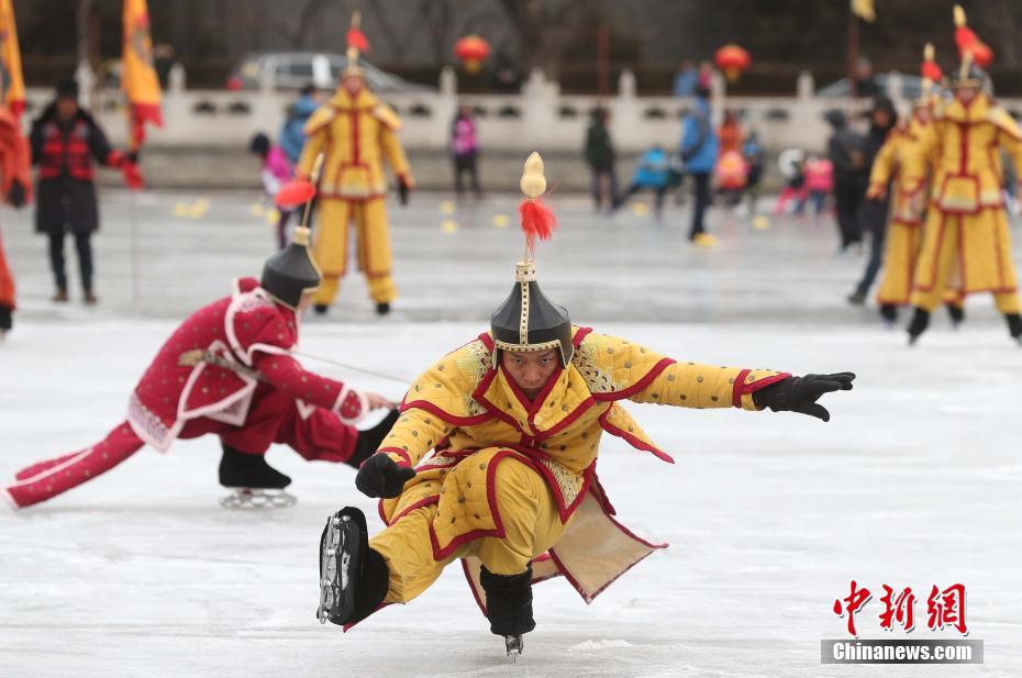 1月20日,“2018北京市体育公益活动社区行启动仪式暨西城区什刹海冰雪嘉年华”在北京什刹海冰场举行。本次活动以“全民健身迎冬奥 快乐冰雪圆梦想”为主题,其中古代传统冰嬉表演、冰蹴球、冰龙舟等项目吸引了大批市民。图为古代传统冰嬉表演引人注目。