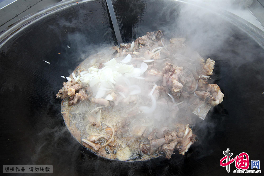 3月21日是诺肉孜节,新疆哈密市开展了的千人抓饭品尝活动,传统的新疆抓饭香飘春日,吸引了许多群众和游客前来品尝。
