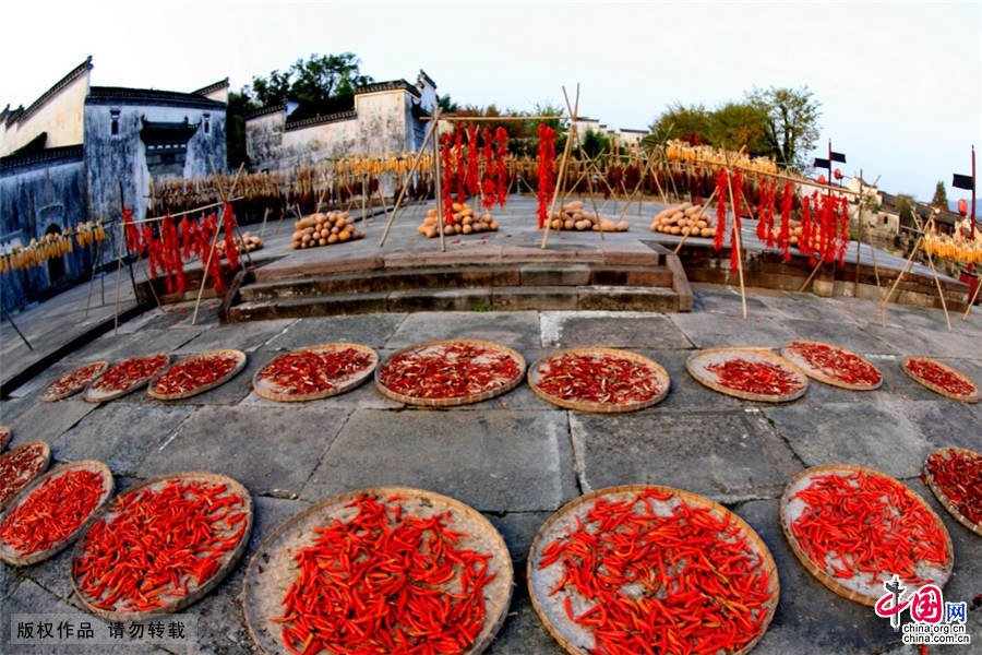 10月25日,在皖南徽州呈坎古村晒场上拍摄的五颜六色的农作物。金秋,是安徽皖南黄山市徽州呈坎古村农民每年秋收果实时节。村民们在圆圆的晒匾里晒出红辣椒、玉米、黄豆、稻谷、荞麦、红豆等五彩缤纷的丰收果实,形成特有的徽派民俗景观,美不胜收,令人叹为观止,徽州呈坎古村巳成为众多游人心目中的“世外桃源”。中国网图片库 施广德 摄