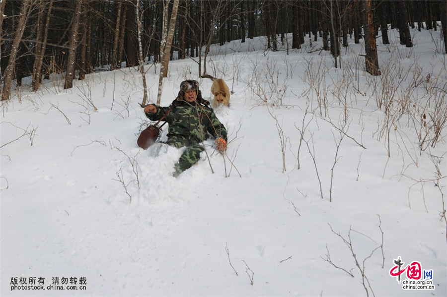 1月19日,巡山中的石文广和他的大黄在半米深的雪中跌倒爬起。 中国网图片库 王薇/摄