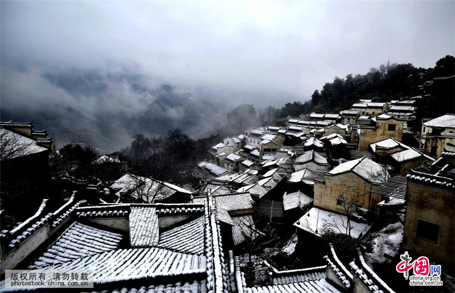 2016年1月21日,江西省婺源县江湾镇篁岭古村雪景如画。