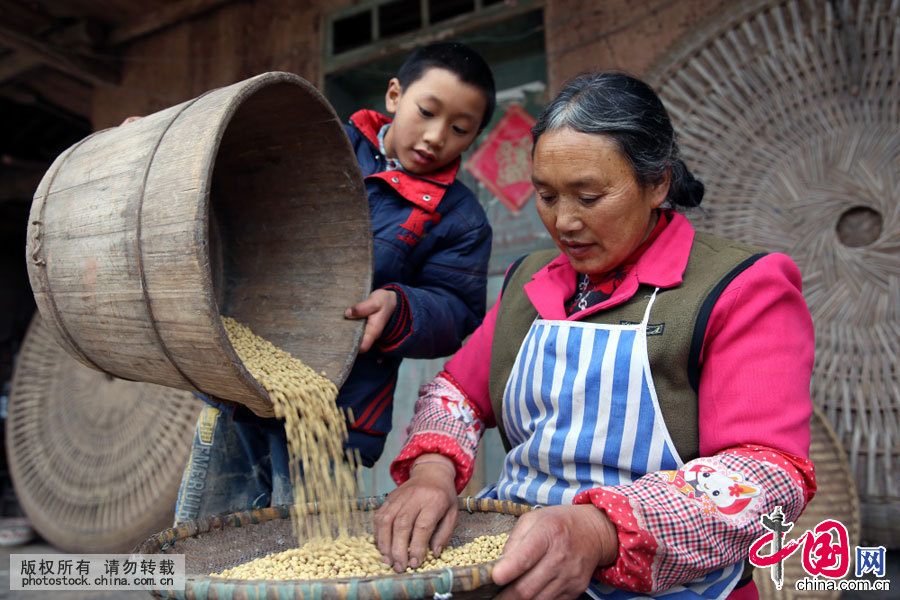 这是农家妇女曾文秀在筛选豆子,孙子赶来帮忙。中国网图片库 饶国君供稿 杨花摄影