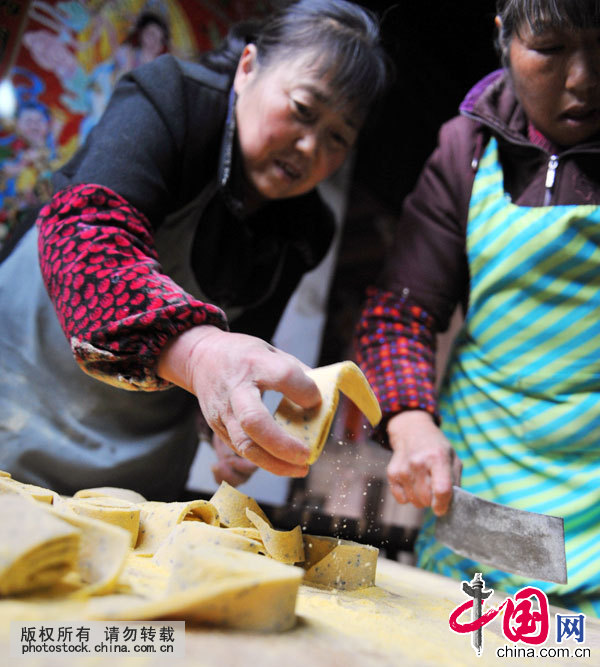 将玉米面粉、糯米蒸熟后,掺入芝麻、白糖揉成面团,擀成面皮,切成条状。中国网图片库胡剑欢摄影