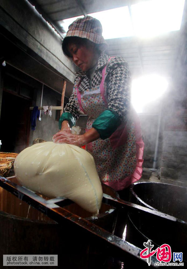 2015年11月15日,湖南省隆回县司门前镇,一家农户正用黄豆和当地高山清水做豆腐,准备制作猪血丸子。