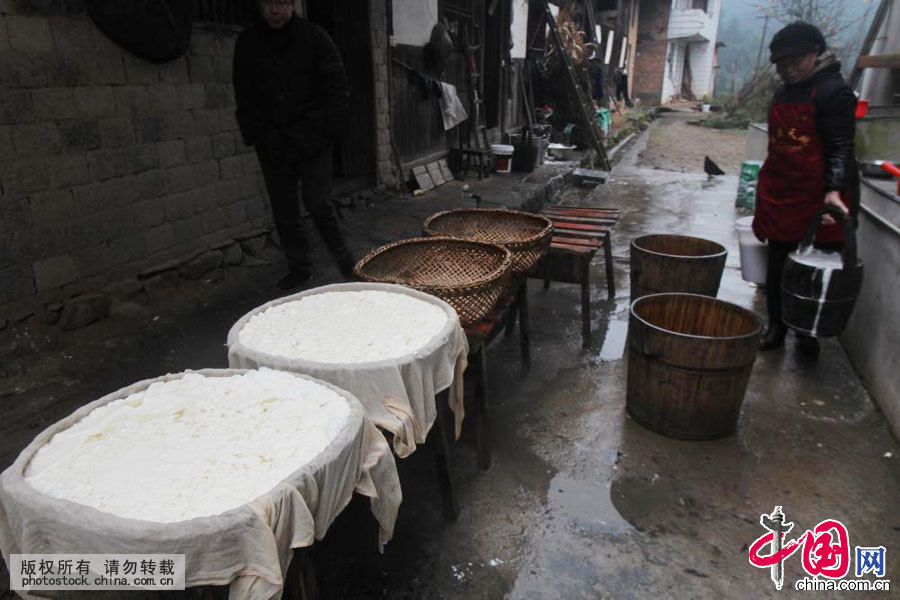 2015年12月24日,湖南省隆回县司门前镇,一家农户正用黄豆和当地高山清水做豆腐,准备制作猪血丸子。