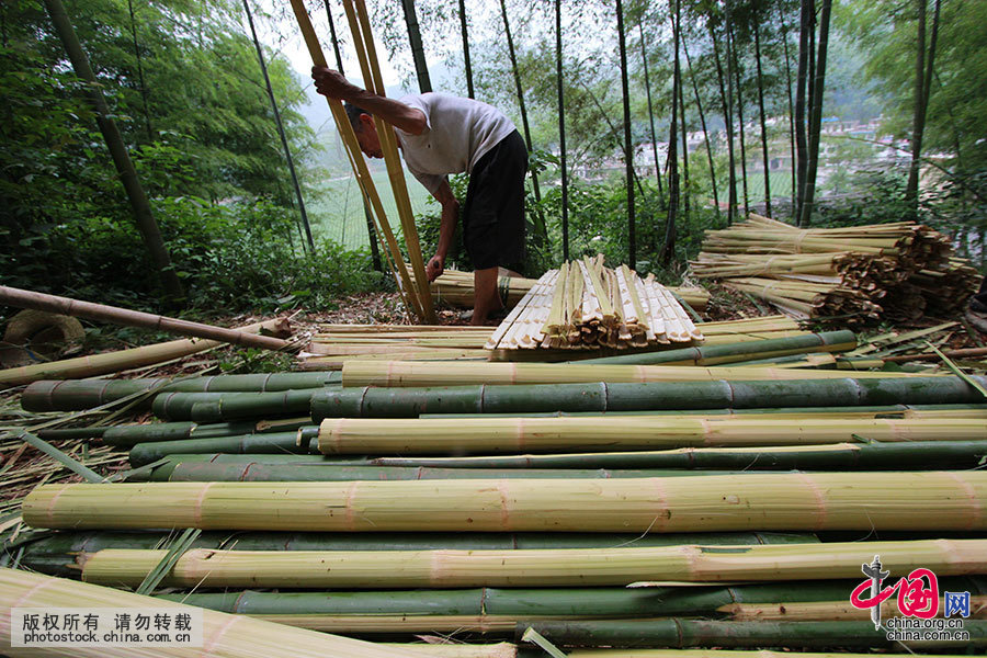 每年小满时节,李志军作坊的工人都要到山上砍楠竹。这个时节的楠竹是手工抄纸最好的原料。小满前后,把砍伐回来的楠竹断成六尺左右的竹筒,刮去青皮,劈成两指宽一片的“白料”,并将白料五十斤左右一捆进行绑扎备用。中国网图片库 曾勇 摄