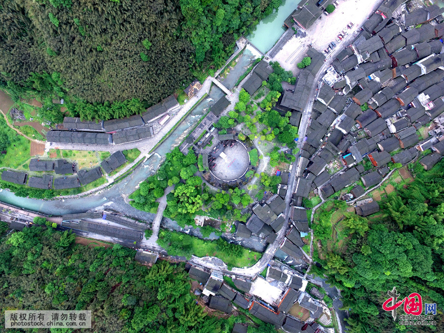 德夯苗寨坐落于湖南省湘西土家族苗族自治州吉首市。处于德夯风景区核心的苗寨依山而建,千山飞瀑环抱,民居飞檐翘角,半遮半掩。封火墙,吊脚楼,雕花窗,造形奇特,格调鲜明,色彩纷呈,丰富多彩,无不显示出远古遗民的氛围。当日(5月21日),空中俯瞰德夯苗寨,苗族特色的民居、清澈的溪流和翠绿树木,构成了一幅美妙的山水画卷。