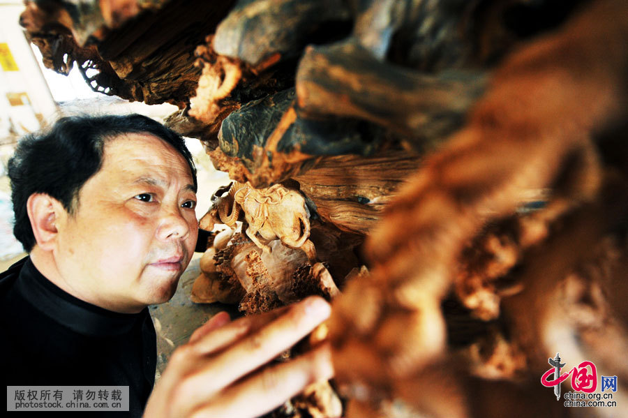 俞有桂正在精心修缮老房子的花雕木刻。中国网图片库 卓忠伟 摄