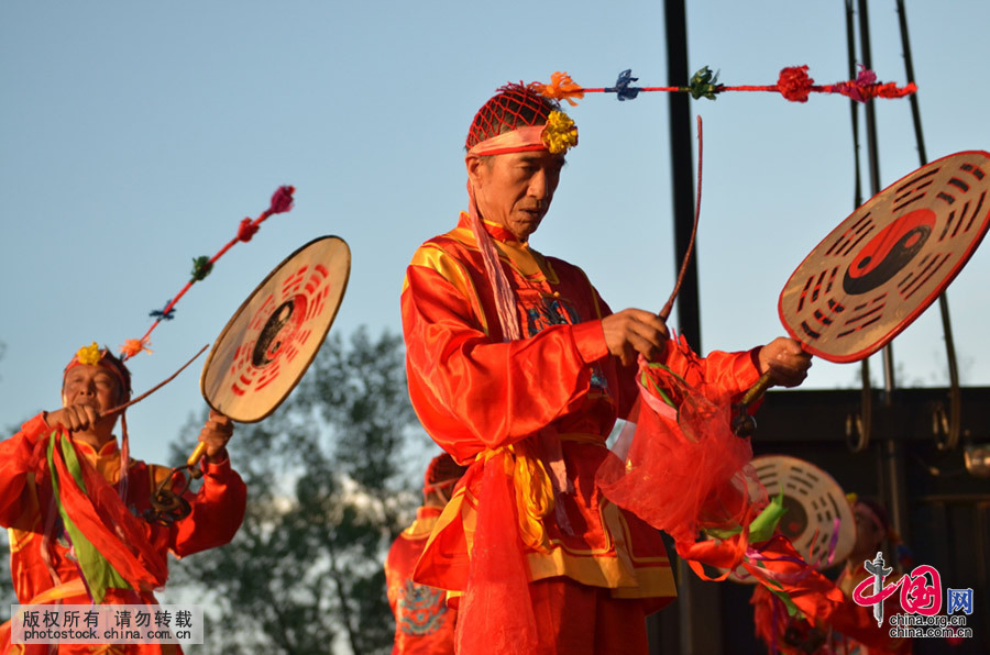 甘肃秦安艺人在陕西省宁强县羌博园表演羊皮鼓舞。吴天文 摄