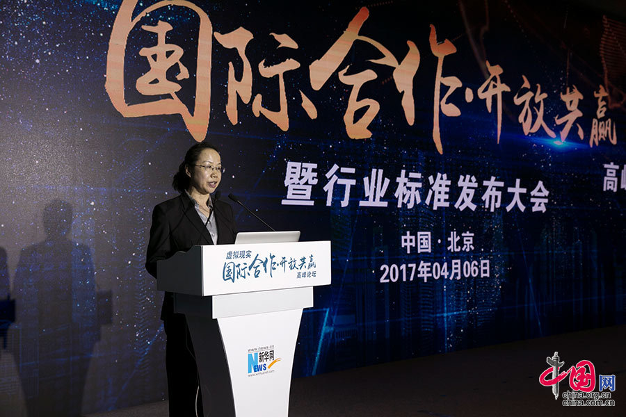 4月6日,中国电子技术标准化研究院党委书记林宁在虚拟现实“国际合作·开放共赢”高峰论坛上正式发布了虚拟现实头戴式显示设备通用规范联盟标准。 中国网记者 董宁摄影