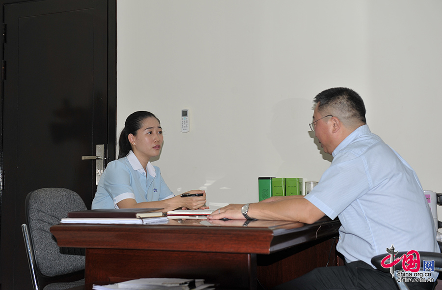 图为财务部门领导向许玉玲交待一天的新工作。许玉玲认真听取并做好记录。