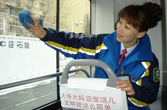 公交集团电车客运分公司104路有一位驾驶员。工作14年来从未出现一次交通违章、一次交通事故。她独创了“站立式”服务和招牌式的笑容感动了无数乘客。刘美莲,一名心系乘客的优秀共产党员、全国劳动模范。