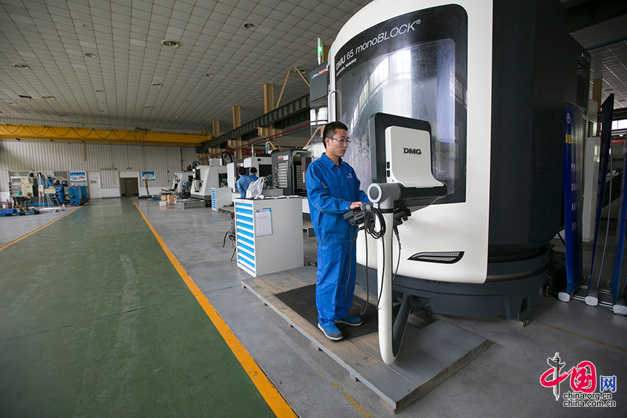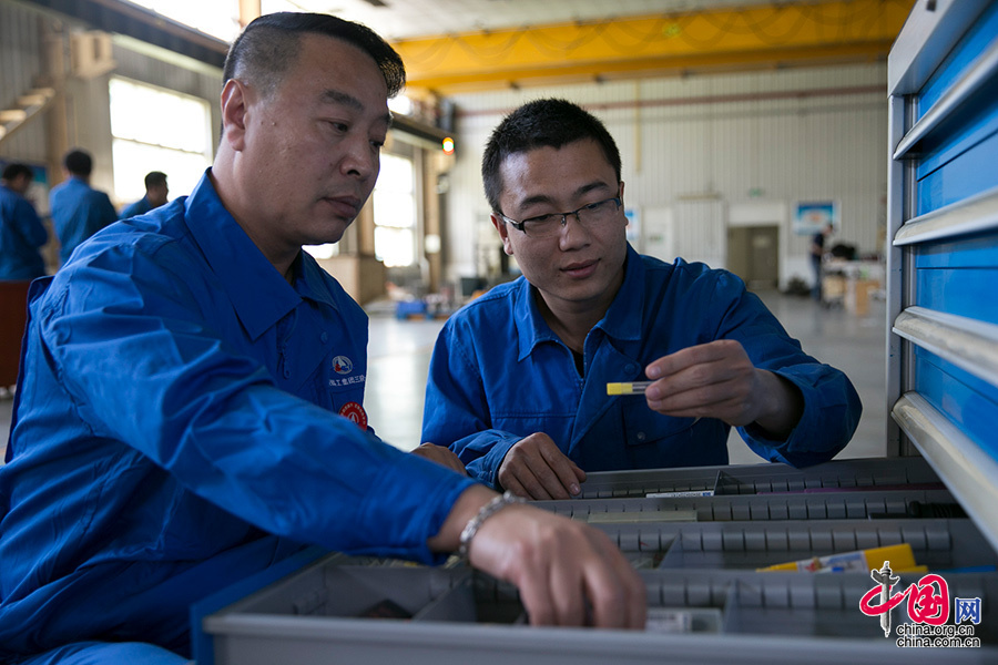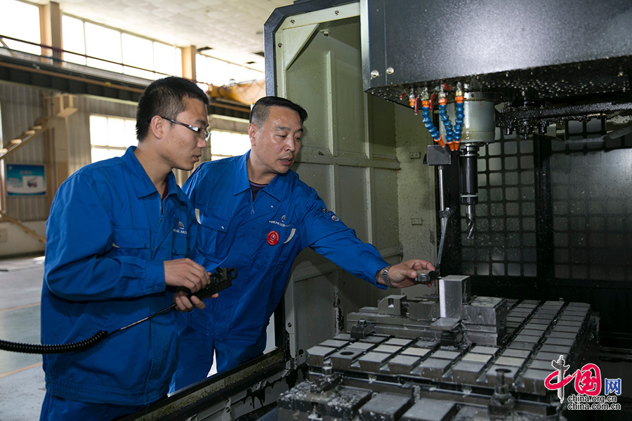 ??? 贺潇强和师傅刘志凯共同在一台机床上轮班工作,刚参加工作时,他因为工作台胡乱摆放工具受到过师傅的批评,如今他和师傅配合越来越默契,操作台也收拾的干净整洁。中国网记者 董宁摄影