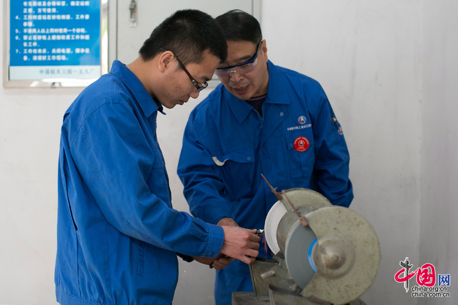 ?制作航天、武器产品所用的刀具都非常的昂贵,而切割的材料又经常是钛合金、精度高速钢等非常坚硬的金属,刀具非常容易损坏。如果平时经常任意更换、丢弃损坏的刀具,会造成极大的浪费,经验丰富的老师傅会根据不同刀具的角度和开刃方式,重新打磨,废物利用。中国网记者 董宁摄影