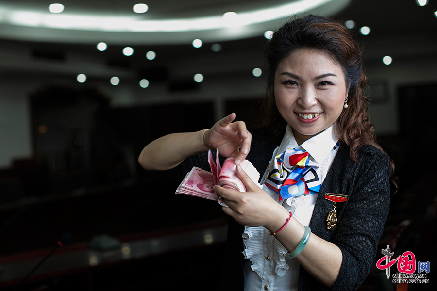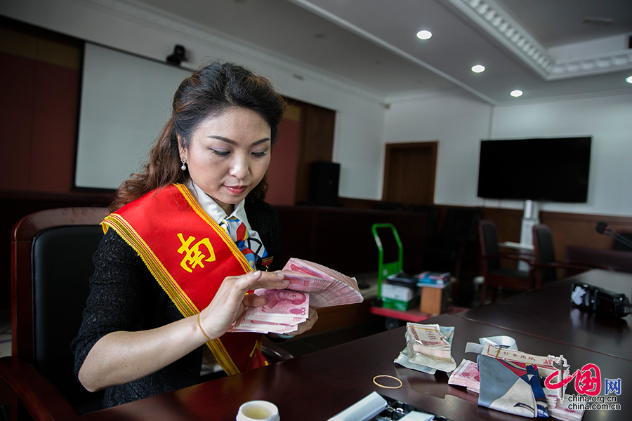 ??? 点钞机数一百张钞票大概需要5到6秒钟,中国人民银行南京支行的陶萍用多指点钞只需要4秒钟。凭借一手让人眼花缭乱的点钞技巧,陶萍在前一段热播的反腐大剧《人民的名义》中也客串了一把,她在剧中本色出演银行工作人员,现场清点国家部委某司的处级干部赵德汉受贿两亿赃款,短短20秒左右的点钞片段让观众直呼过瘾。中国网记者 董宁摄影