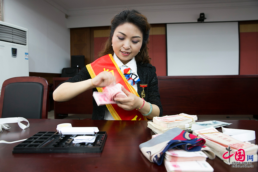 陶萍展示扇面点钞法。从点钞达人到反假卫士,与钞票亲密接触近30年的陶萍乐此不疲。 中国网记者 董宁摄影