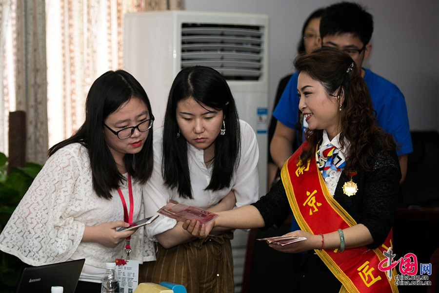 陶萍向现场记者介绍快速辨识假币的方法。中国网记者 董宁摄影