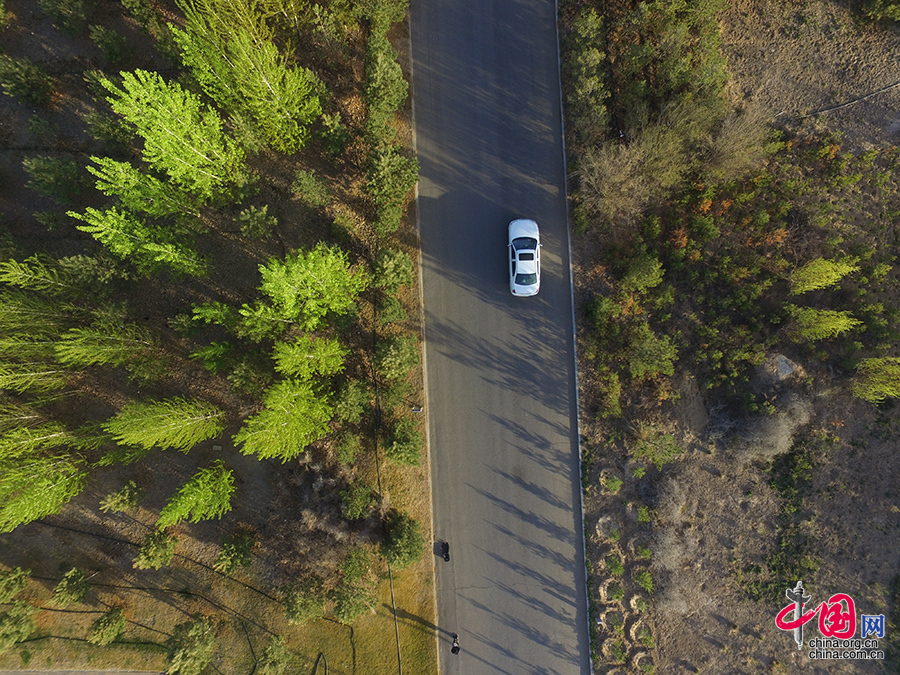 在当地政府和亿利集团的共同努力下,1997年,第一条穿沙公路开始动工,一场人沙大战正式打响。一首顺口溜多少描述了当年修路的艰辛,“清汤挂面碗底沙,夹生米饭沙碜牙,帐篷睡听大风吼,早晨起来脸盖沙”。经过两年半的努力,从锡尼镇到乌拉山脚下,65公里的首条穿沙公路建成。这条路打通了库布齐的血脉,源源不断的输送着养分,沙漠如枯木逢春逐渐焕发神采。中国网 杨佳 摄影报道