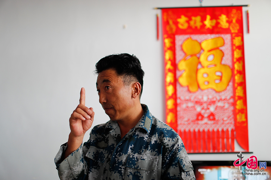 来自赤峰的张白喜带着蓝色的安全帽,手拿电批站在铁架上,等着开工程车辆的同事吊运来光伏发电板。他刚来这里几天的时间,负责装配光伏板,一个小组5-6个人,一天能安装两三百块。张白喜安装的太阳能板4个一组,每片呈长方形,面积1平方米左右,板子下面连着输出线缆,每组板子由一个电机控制,随着日光转动。中国网 杨佳 摄影报道