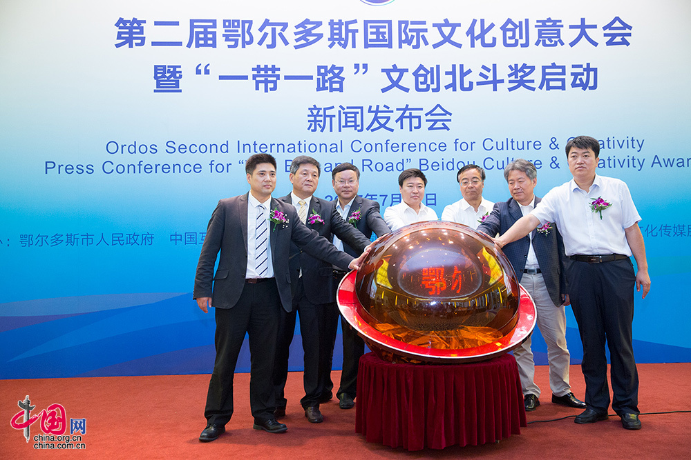 中国网7月21日讯(记者孙婉露 杨佳)7月21日,第二届鄂尔多斯国际文化创意大会暨“一带一路”文创北斗奖启动新闻发布会隆重召开。鄂尔多斯市委副书记、市人民政府市长龚明珠,市委常委、东胜区委书记于新芳,中国互联网新闻中心副主任李富根等领导及北京大学文化产业研究院教授王齐国等嘉宾共同出席了发布会。