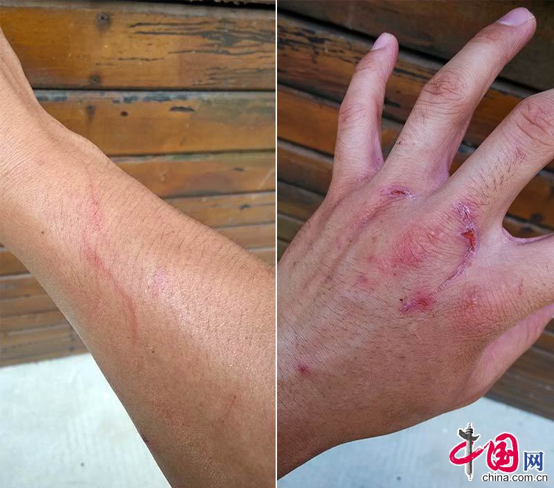 据查实,当日,三位值班的饲养员给饲养在大厅内的4只幼仔喂食,同时打扫卫生,圆满、梅兰很快食完并与其中一饲养员玩(主要为了防止吃完食物的大熊猫幼仔影响其他饲养员打扫卫生的操作)。在玩的过程中,两幼仔兴奋将该饲养员的手臂抓伤。卫生打扫完后,由于基地疾控部安排7月13日对圆月、梅兰进行医学体检,需将圆月、梅兰与其他大熊猫两幼仔隔离而单独饲养在大厅内。在进行转移圆满、绩兰时,圆月、梅兰也竭力想出大厅门,而饲养员用力不让其离开,故从门口或门外拖大熊猫幼仔回大厅。在此过程中,兴奋的大熊猫幼仔出现了无意识的抓咬饲养员的情况,导致三位饲养员都不同程度受伤(见图,拍摄日期:7月14日)。为了防止两只大熊猫幼仔再次伤人和逃出大厅门,饲养员拖、放大熊猫幼仔的动作幅度过大、过猛而快速。为防止熊猫抓伤咬伤后感染狂犬病,当事饲养员7月12日晚立即赶到四川省第四人民医院挂急诊,先后注射了3针狂犬疫苗。