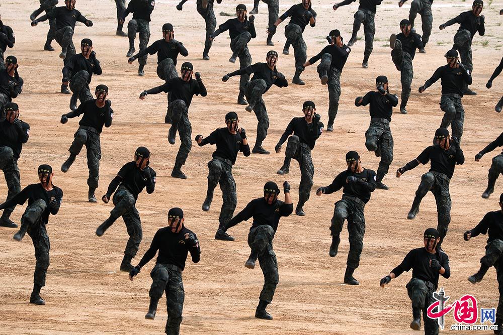 格斗技能汇演中,200余名特战队员训练场演示倒功摔擒。中国网 杨佳摄影