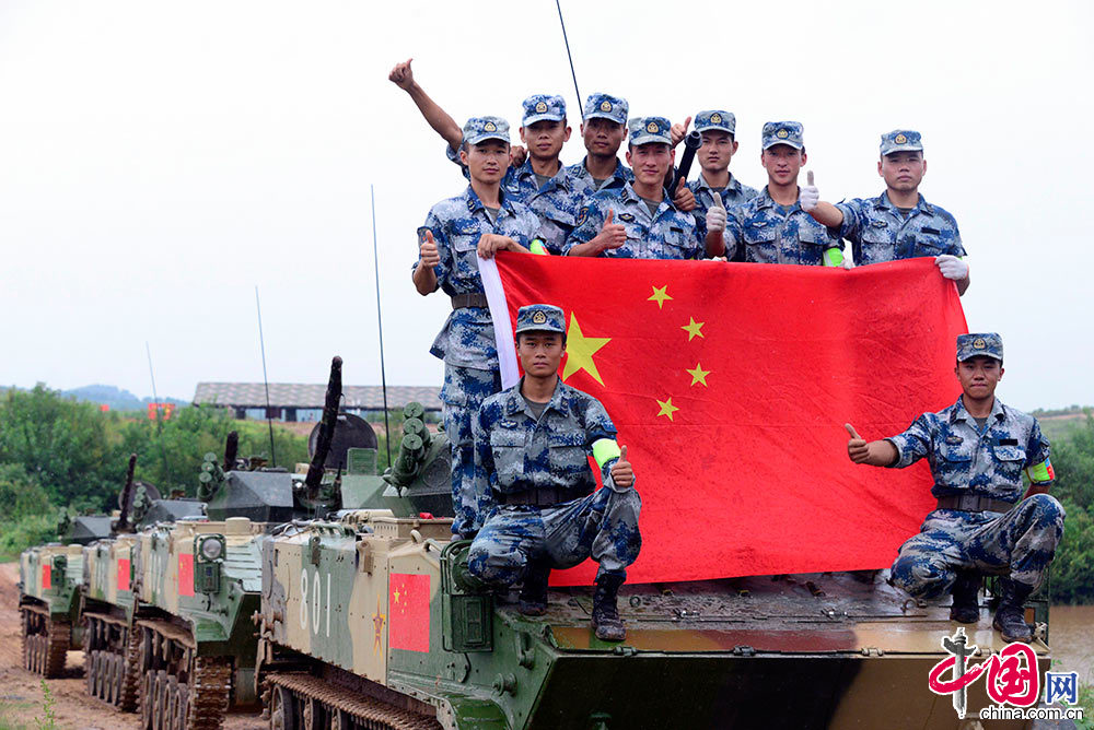中国网8月9日讯(通讯员 蒋 龙 谭荣勇 王志明)8月8日,昨夜暴雨侵透的湖北广水空降兵某训练场山野赛道,一早列阵的各国战车格外亮眼。中午12时整,伴随发动机强劲的轰鸣,俄罗斯战车组率先冲出起点线,拉开了“国际军事比赛-2017”空降排项目“压轴之战”——“战车接力赛”的序幕,中国、俄罗斯和哈萨克斯坦代表队再次展开激烈角逐。