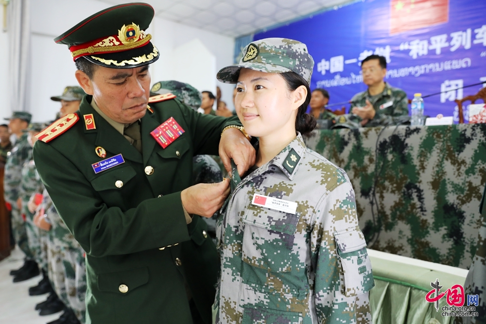 图为医疗服务活动闭幕式上琅南塔省军区因乔司令员为队员佩戴友谊勋章。陈晓霞 摄
