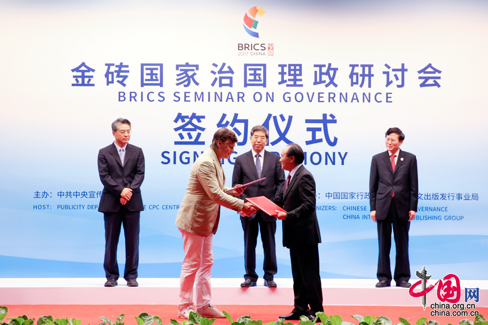 (中国网福建泉州讯)为助力构建金砖国家人文大交流格局,充分发挥金砖各国高端智库研讨交流的主渠道作用,服务金砖友好大局,8月18日上午,在由中宣部主办、国家行政学院和中国外文局承办的金砖国家治国理政研讨会期间,中国外文局与前来参会的俄罗斯科学院欧洲研究所、巴西中国问题研究中心、印度德里大学东亚研究和社会科学院、南非《思想者》杂志等4家机构签署了《关于学术研究及传播领域合作备忘录》。中国国家行政学院常务副院长马建堂、中宣部副部长庹震、中国外文局局长张福海出席签约仪式,中国外文局副局长王刚毅分别与合作机构负责人签署并交换了合作协议文本。