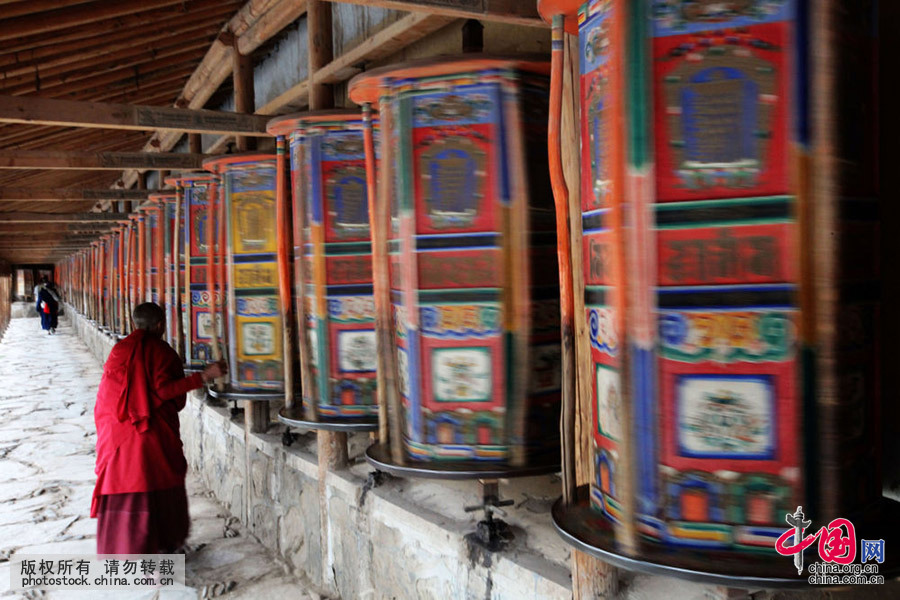 在甘肃省甘南藏族自治州拉卜楞寺内,藏民在转经筒。袁纯刚 摄