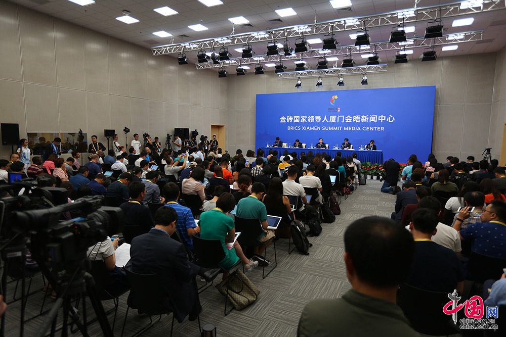 9月2日,2017年金砖国家工商论坛组委会在金砖国家领导人厦门会晤新闻中心召开新闻发布会,介绍2017年金砖国家工商论坛有关情况,并回答记者提问。中国网 郑亮 摄影