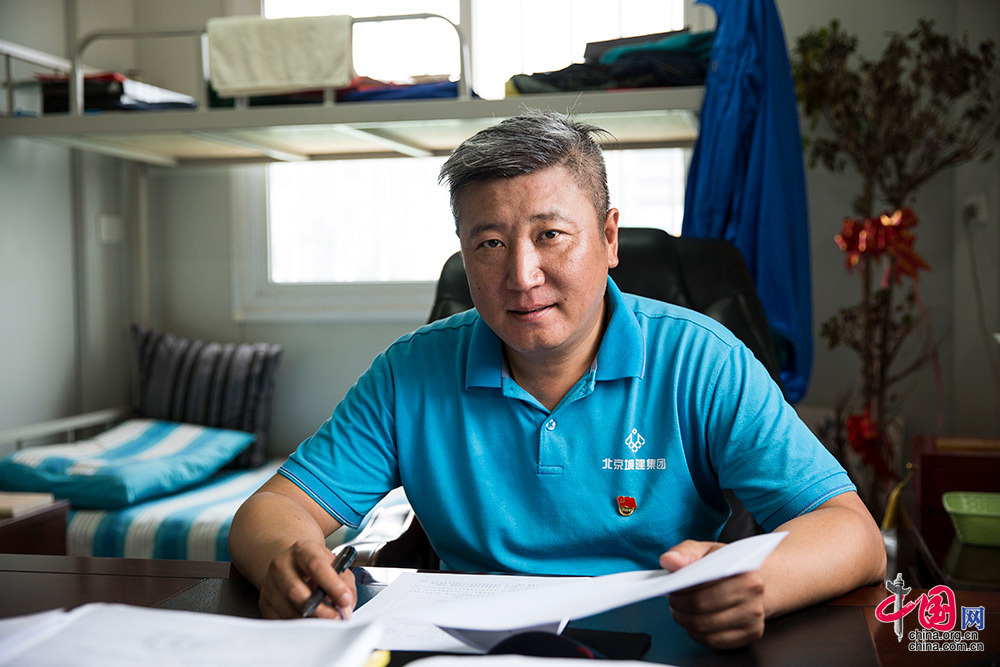在项目部临时搭建的简易房中,有一间宁卫东的办公室,里面有一张单人床,虽然宁卫东的家就在北京,可是他一直坚持吃住在工地上,2016年和2017年连续两年春节,宁卫东都坚守在工作岗位上。中国网记者 董宁摄