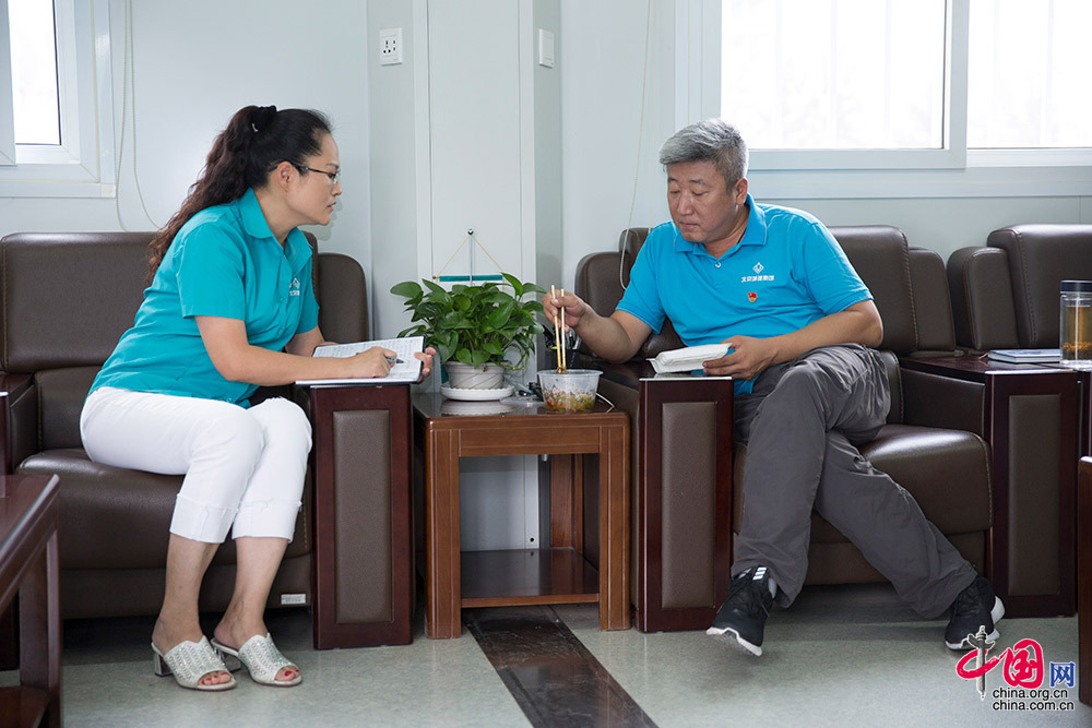 7月14日中午12点,刚刚开完北京城市副中心指挥部的两个协调会,宁卫东匆匆赶回项目部,在办公室简单吃点午饭。吃饭时间,项目部党支部副书记王首娟向宁卫东汇报工作。中国网记者董宁摄