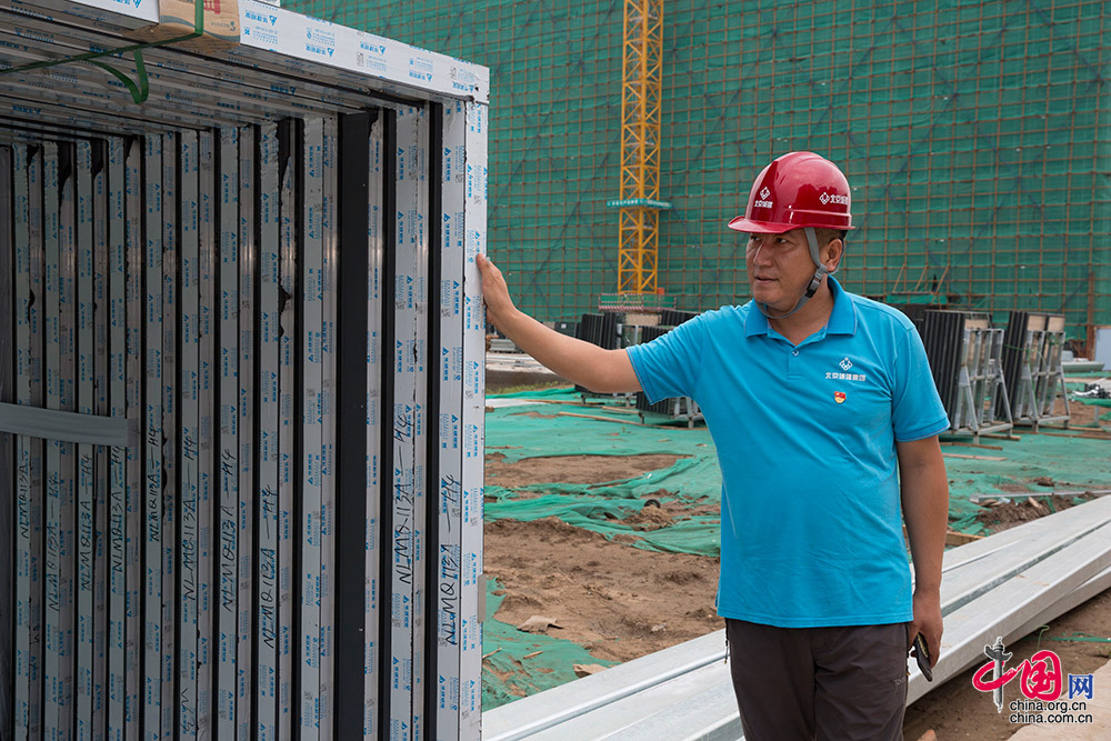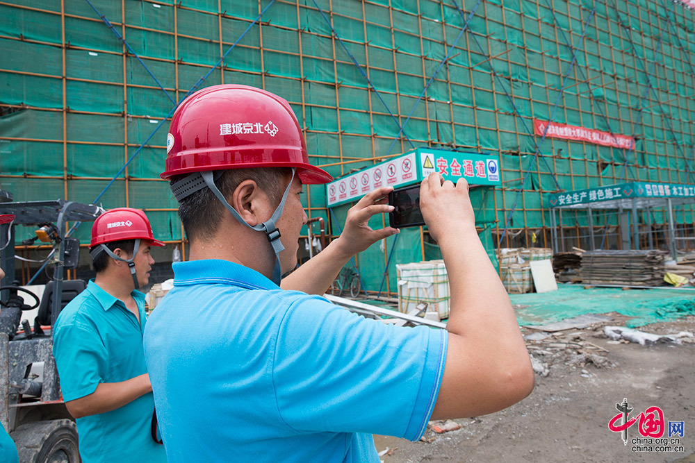 每天中午,宁卫东都会到工地转一圈,确认工程进度,检查施工情况。A1工程建筑面积31.9万㎡,东西长900米,南北宽360米,2017年的夏天酷热难耐,一圈转下来,需要半个多小时,他每天至少要转3、4圈。中国网记者董宁摄