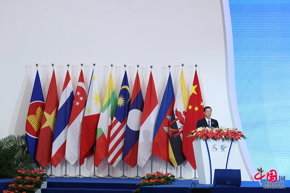 中共中央政治局常委、国务院副总理张高丽发表主旨演讲。中国网记者 杨佳 摄