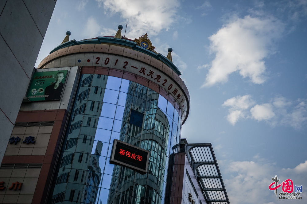 在天意市场的楼下,抬头看见已有些褪色,但依旧醒目的“庆祝市场20周年”字样。中国网记者 郑亮摄影