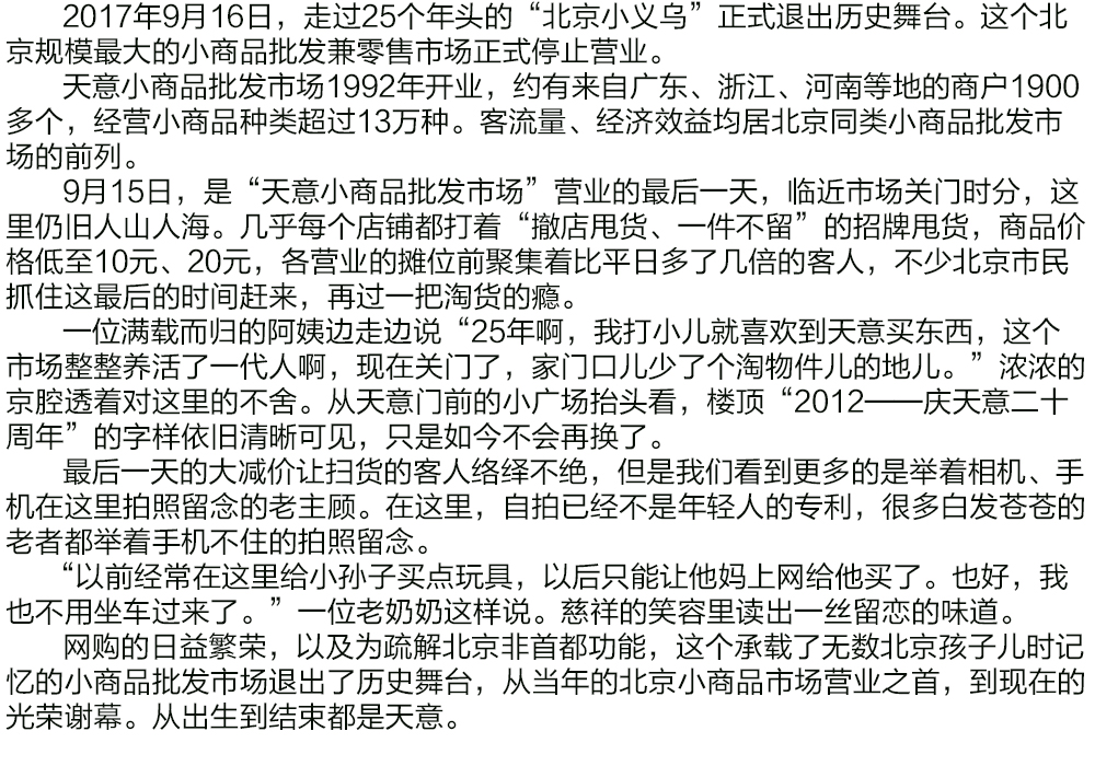 2017年9月16日,北京天意小商品批发市场正式停止营业。从1992年到2017年存在了25年的“北京小义乌” 正式关门停业。9月15日晚,市场最后一天营业,关门的音乐已响过许久,但是仍有很多老顾客站在门口,久久不愿离去。中国网记者 郑亮摄影