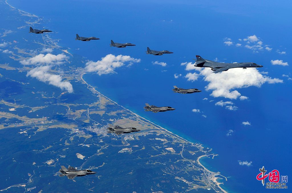 据了解,当地时间2017年9月18日,美军向朝鲜半岛上空出动2架B-1B轰炸机和4架F-35战斗机,与4架韩国战机进行了投弹演习,共投下了10枚炸弹。韩国国防部官员表示,美军B-1B轰炸机是从关岛起飞,F-35战机则是从驻日美军基地起飞。韩国国防部称,当天的行动意在向朝鲜发出警告。