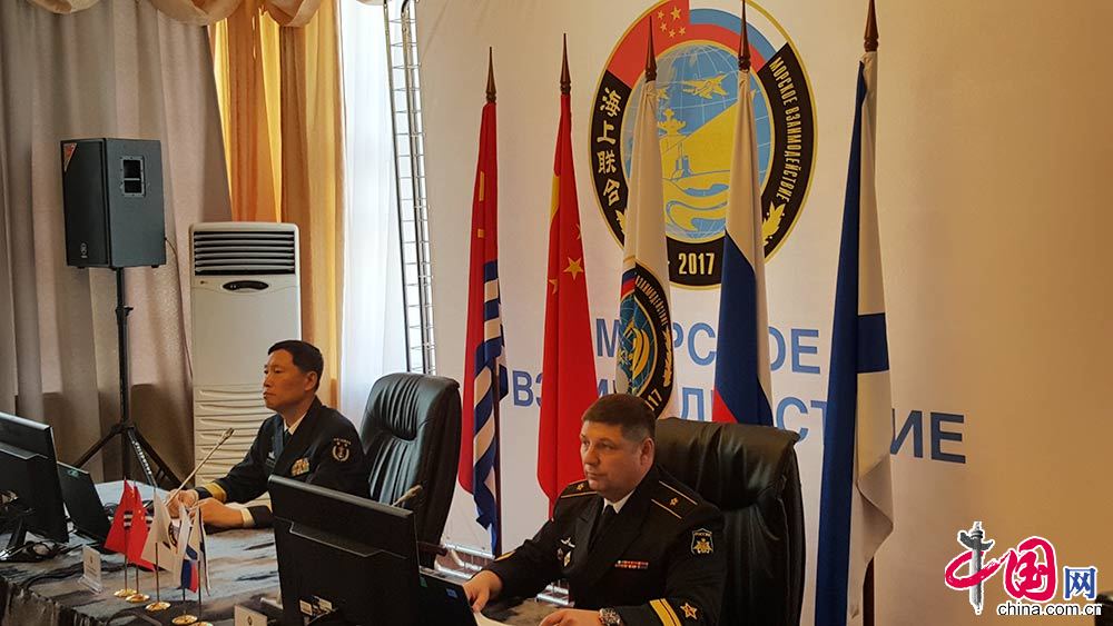 9月19日,中俄“海上联合-2017”第二阶段演习第二天。中俄双方导演部、指挥部人员和海上战术群人员在联合指挥部集合,中方总导演田中和俄方总导演费多坚科夫听取演习实施计划报告,并共同签署作战命令。中国网鲁楠摄影