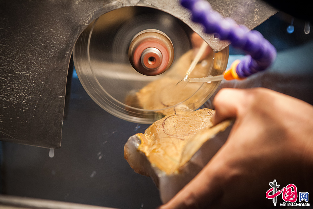 拿到一块玉石材料后,要根据成色和完整度等判断是否适合制作鼻烟壶,再画出轮廓。如果在切割后发现里面有裂痕,那选料就是失败的。因此要先了解透玉石,这在热爱玉石的李克生眼中,就是“与玉石交流、交心”。