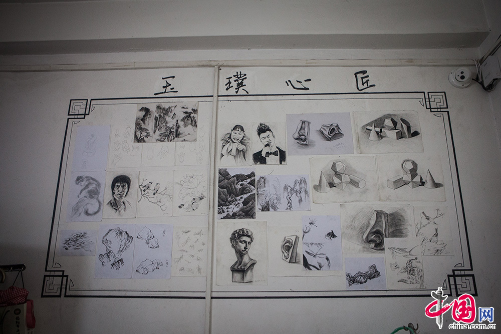 根据徒弟们的功底和性格,李克生会因材施教,发掘每个人的特长。但不管资质如何,李克生总要叮嘱徒弟们先把自己的素养和思想修行好,“雕玉先雕心”。工作室的墙上挂着徒弟们的绘画习作。晚饭后,李克生经常指导徒弟们进行绘画练习。中国网记者 伦晓璇 摄
