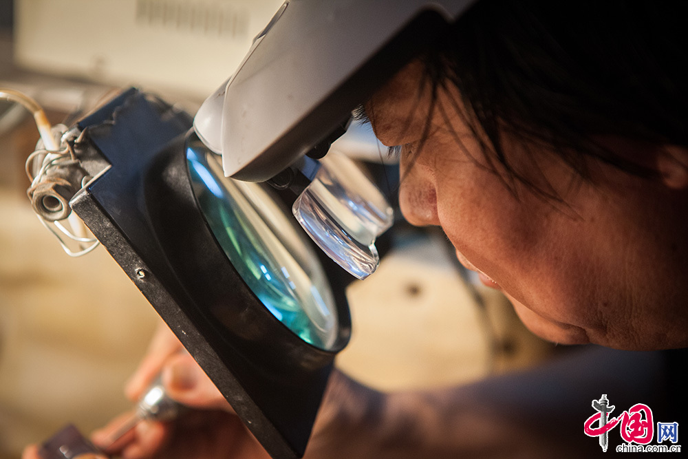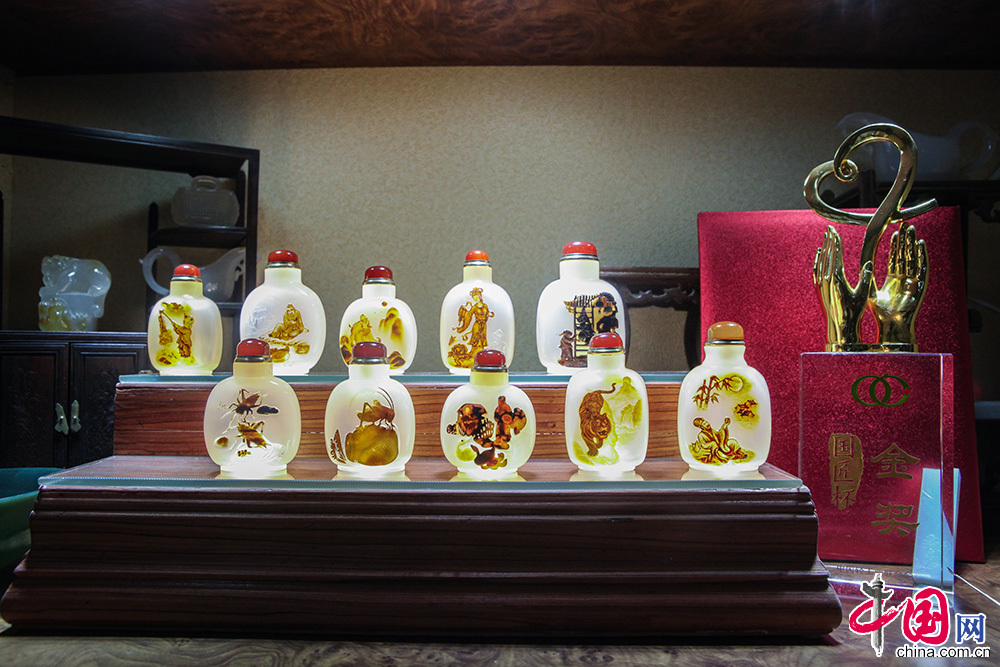除了内容创新,李克生也在技艺上不断创新。鼻烟壶的图案在灯光下变得栩栩如生,富有立体感。中国网记者 伦晓璇 摄