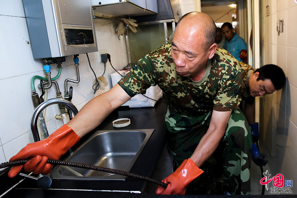 王大爷的腿脚不太方便,张喜忠清理完下水道后,主动帮王大爷的厨房做清洁工作,这是一次免费的义务劳动。自从2008年张喜忠成立北京老兵保洁服务中心以来,就开始对残疾人、孤寡老人、特殊困难户进行免费服务。中国网记者 董宁 摄影