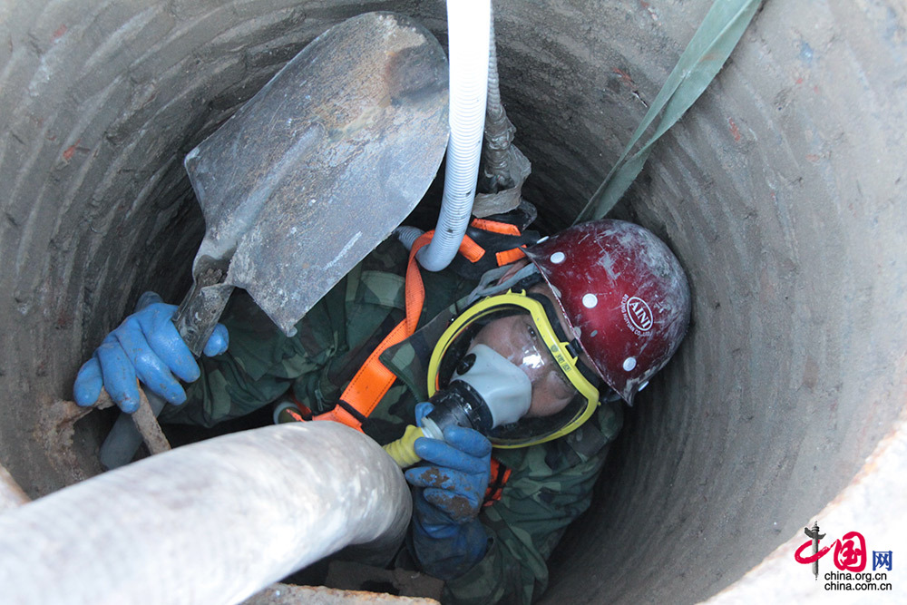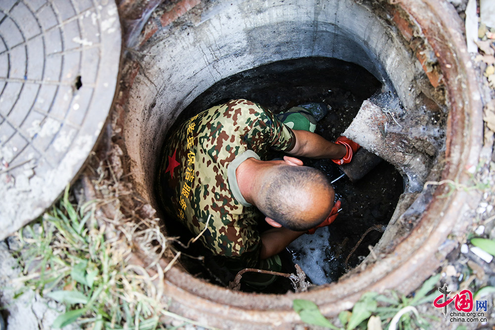 下水道内空间狭小,气味刺鼻,58岁的张喜忠每次都身先士卒,挑最苦的活干。17年来,张喜忠带领北京老兵保洁服务中心的员工总共免费为北京市海淀区田村路街道28个社区的孤寡老人和敬老院疏通下水管道,清掏厕所等义务服务5000多次。中国网记者 董宁 摄影